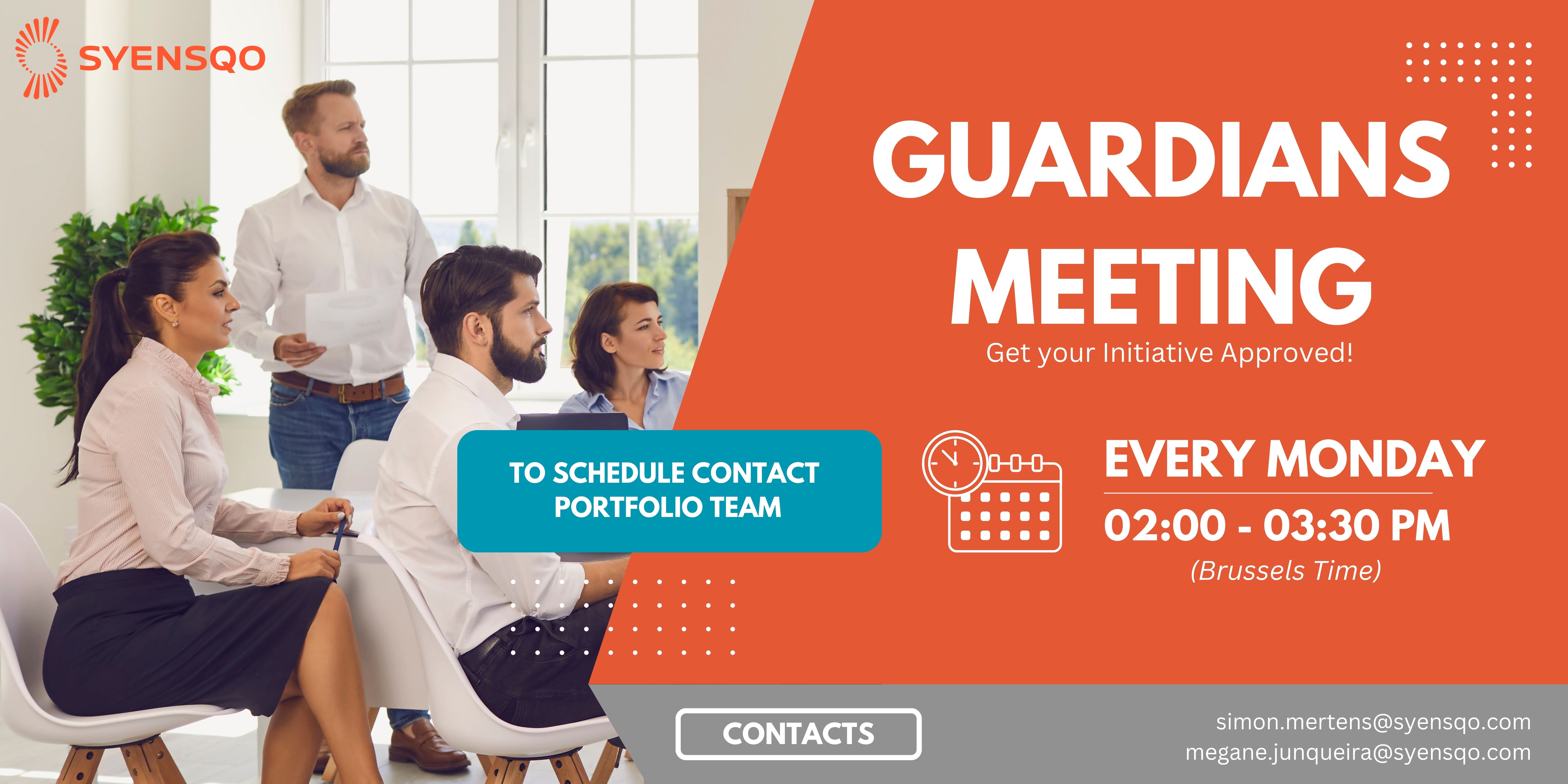 To secure a slot at the Guardians Meeting and present your initiative, all you have to do is contact the Portfolio Team ( Simon Mertens or Mégane Junqueira) at least one working day in advance and ask for a slot for the next meeting.