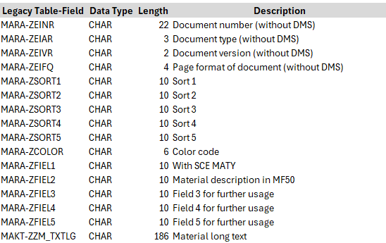 002PF2-020: confirm the usage of field MARA-ZZM_TXTLG and whether it should be included in the Data Migration to the target system.