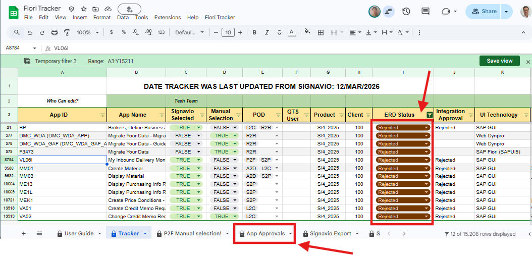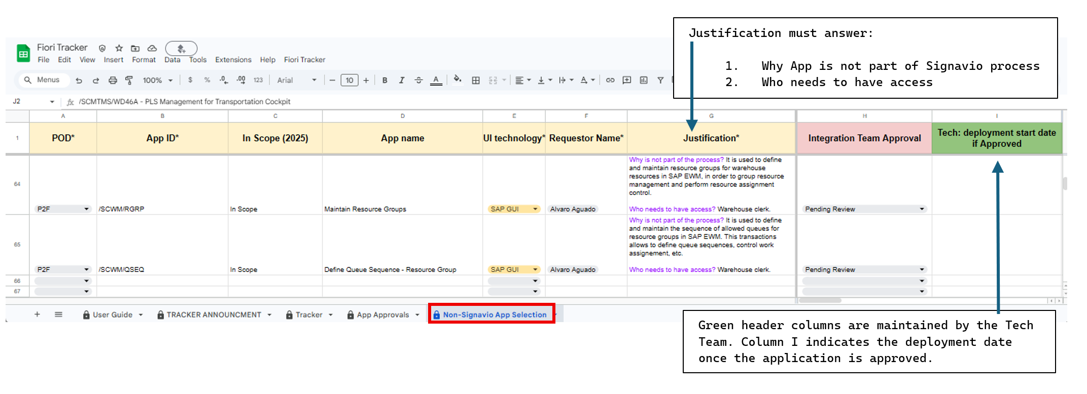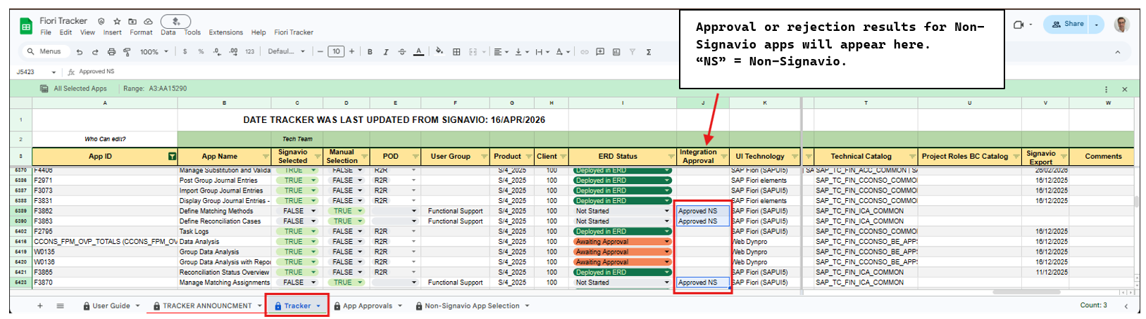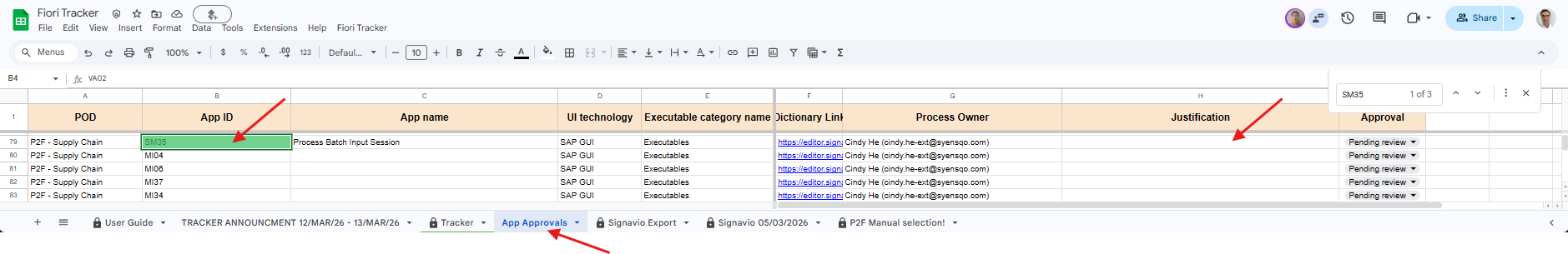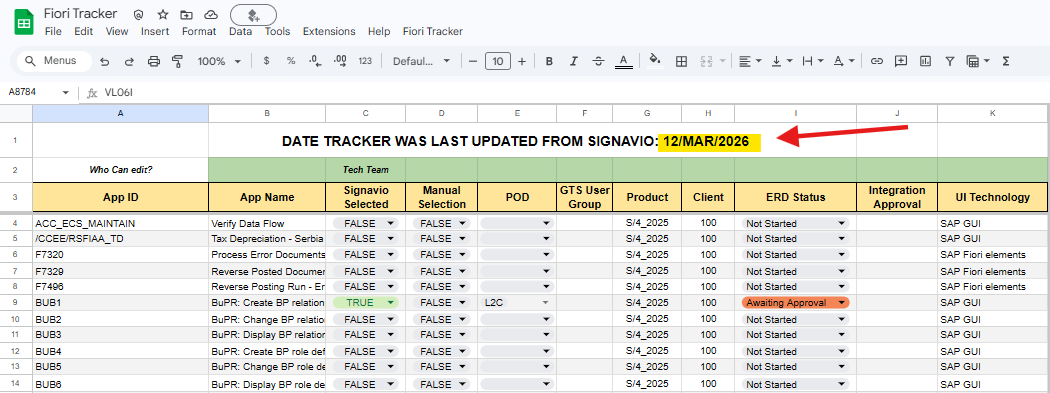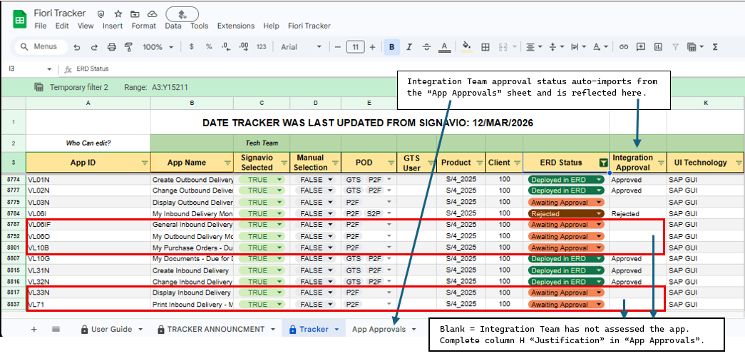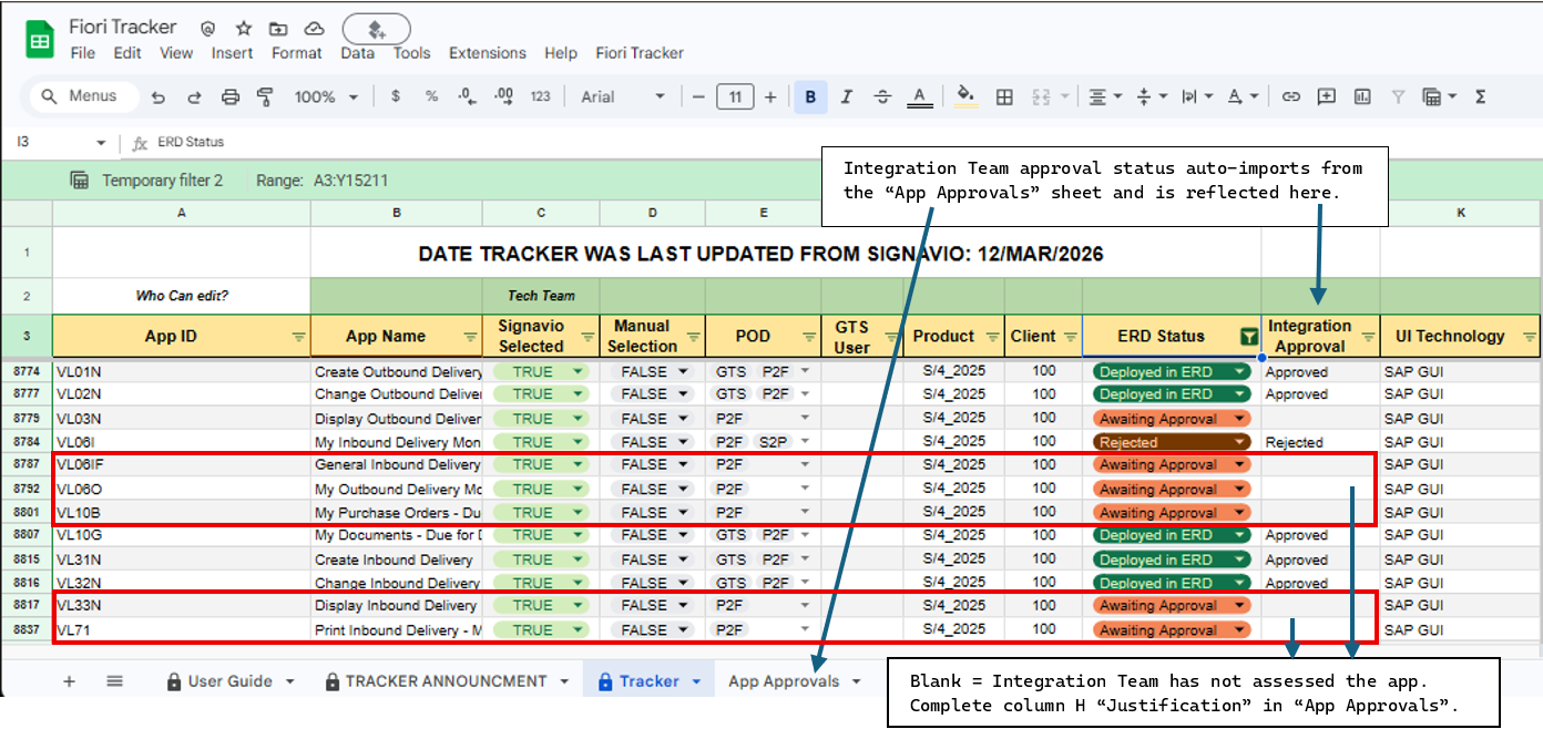 The Fiori Tracker spreadsheet is updated from Signavio every Thursday. Suggested Executables automatically appear in the App Approvals sheet.