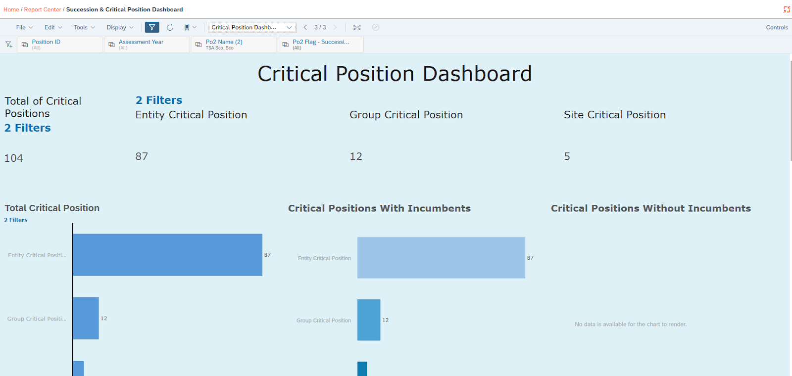 - Succession & Critical Position Dashboard | displays all positions that have identified successors, along with their successor details; provides a view of critical positions across the organization, with the ability to filter on the type of critical position to display further details; ability to view performance details of incumbents occupying critical positions within the organization.