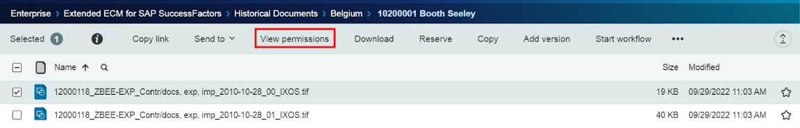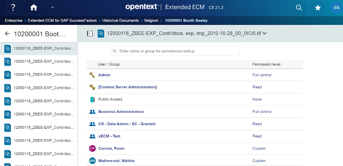 This feature displays the permissions that are granted to users and groups with respect to the selected document.