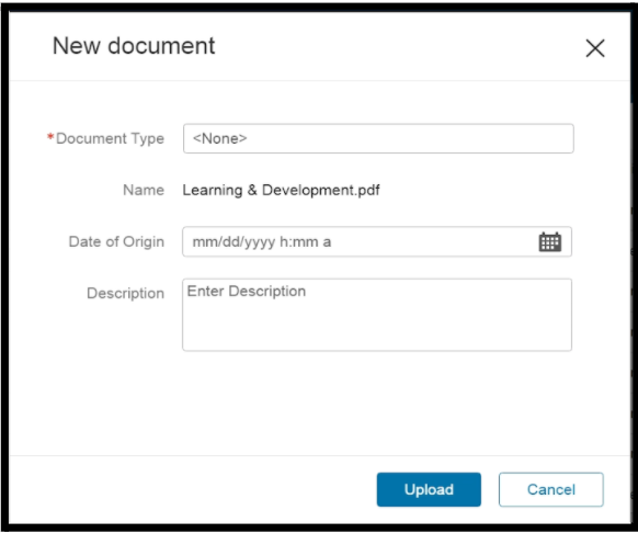 - You have the option to enter a date in the field called “Date of Origin” as well as a description of the document in the field called “Description”. Once all the details are entered click on “Upload” and the document will be saved in the designated Folder.