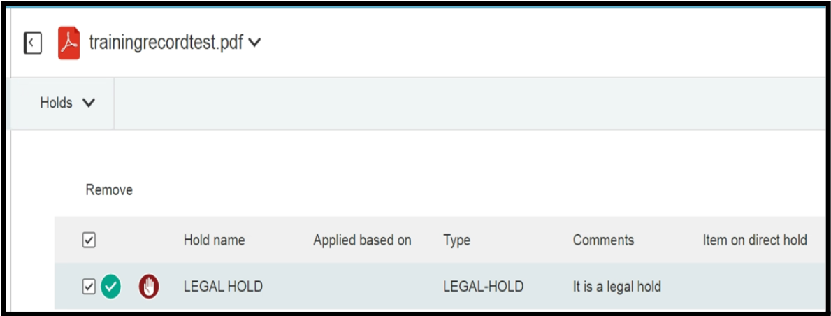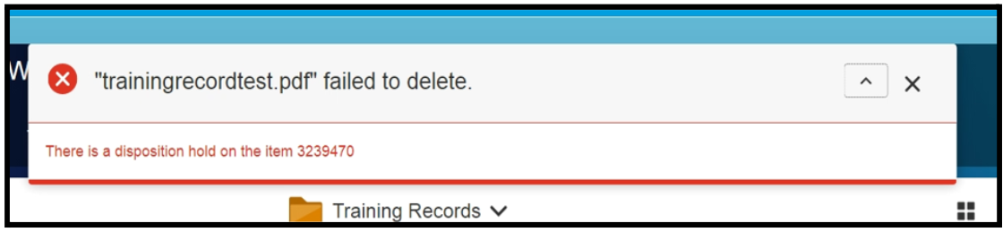 If a file has a Legal Hold applied and someone tries to delete it, an error message pops up as shown below.
