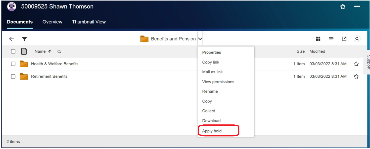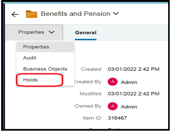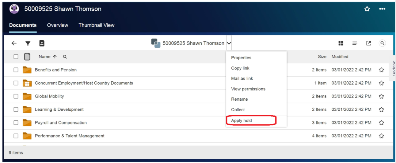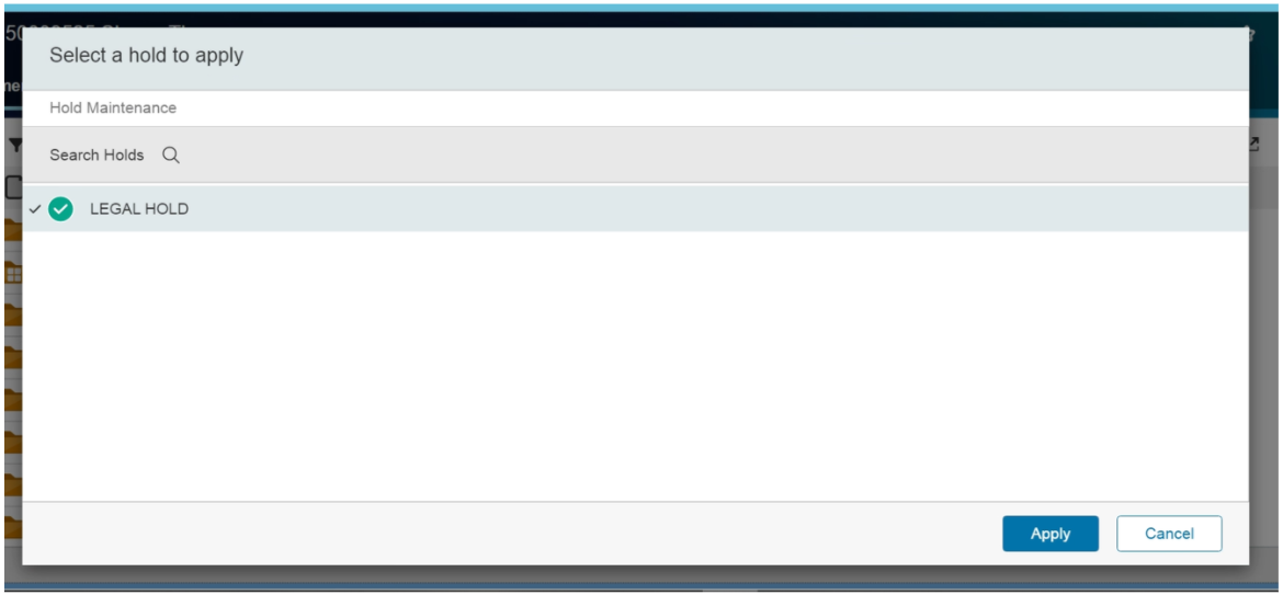 Technically within Open Text, a Legal Hold can be applied and removed at the Workspace level (all folders/all documents), the Folder level or the Document level though typically it would be managed at the Workspace level. Instructions for each of these levels is provided below.