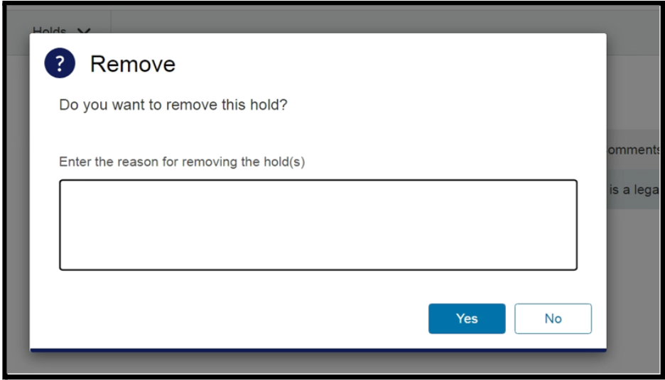 A confirmation pop up will appear as shown below. Capture the name of the person providing the instruction to remove the legal hold, the date this was effective, and the associated ticket number. Then click on Yes.