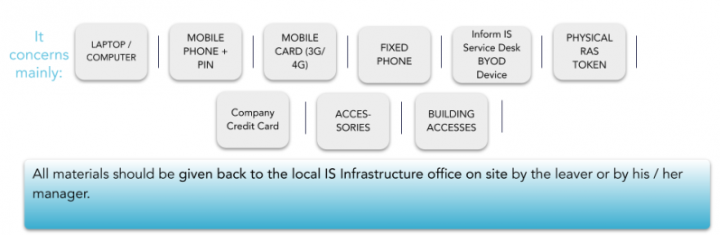 • Remind your manager to book a meeting with your local infrastructure team to return your equipment (PC, Phone, Sim Cards, etc...);