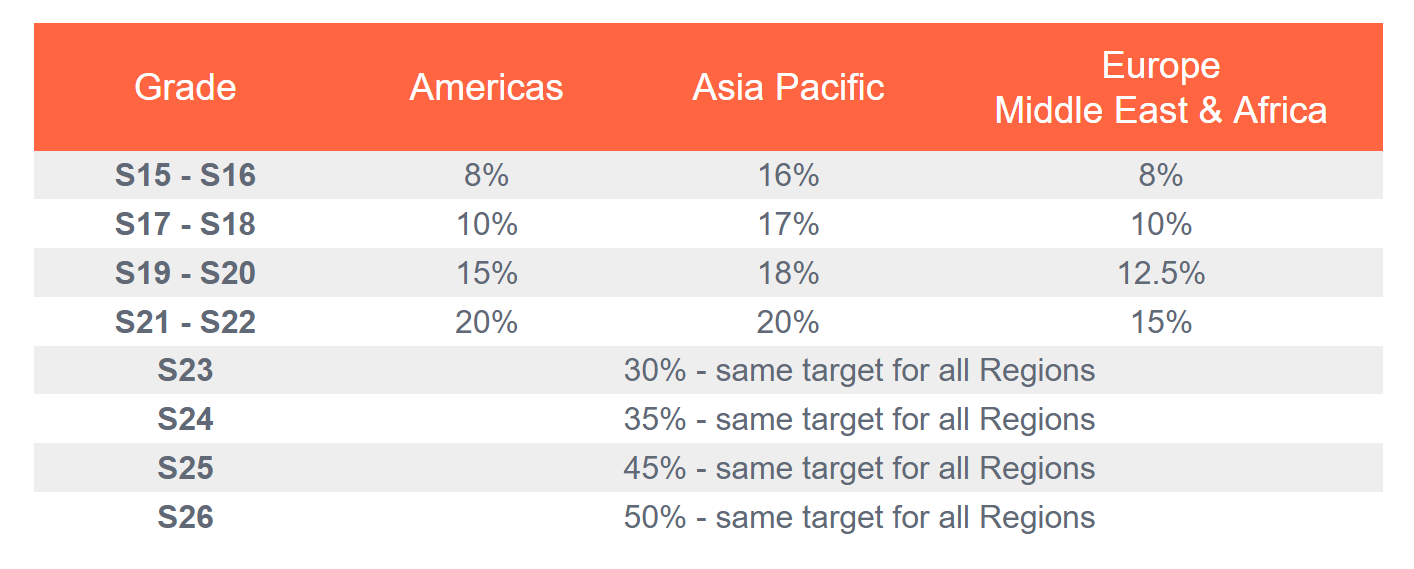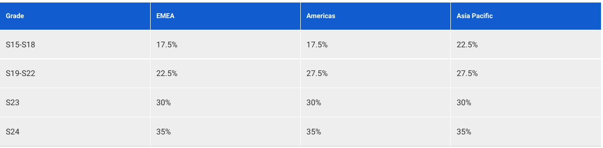 The STI Bonus Target is determined as a percentage of annual base salary for positions graded at S15 and above and has been set by region and grade. For grades S23 and above, the @Target percentage of annual base salary is set globally and is the same in all countries.