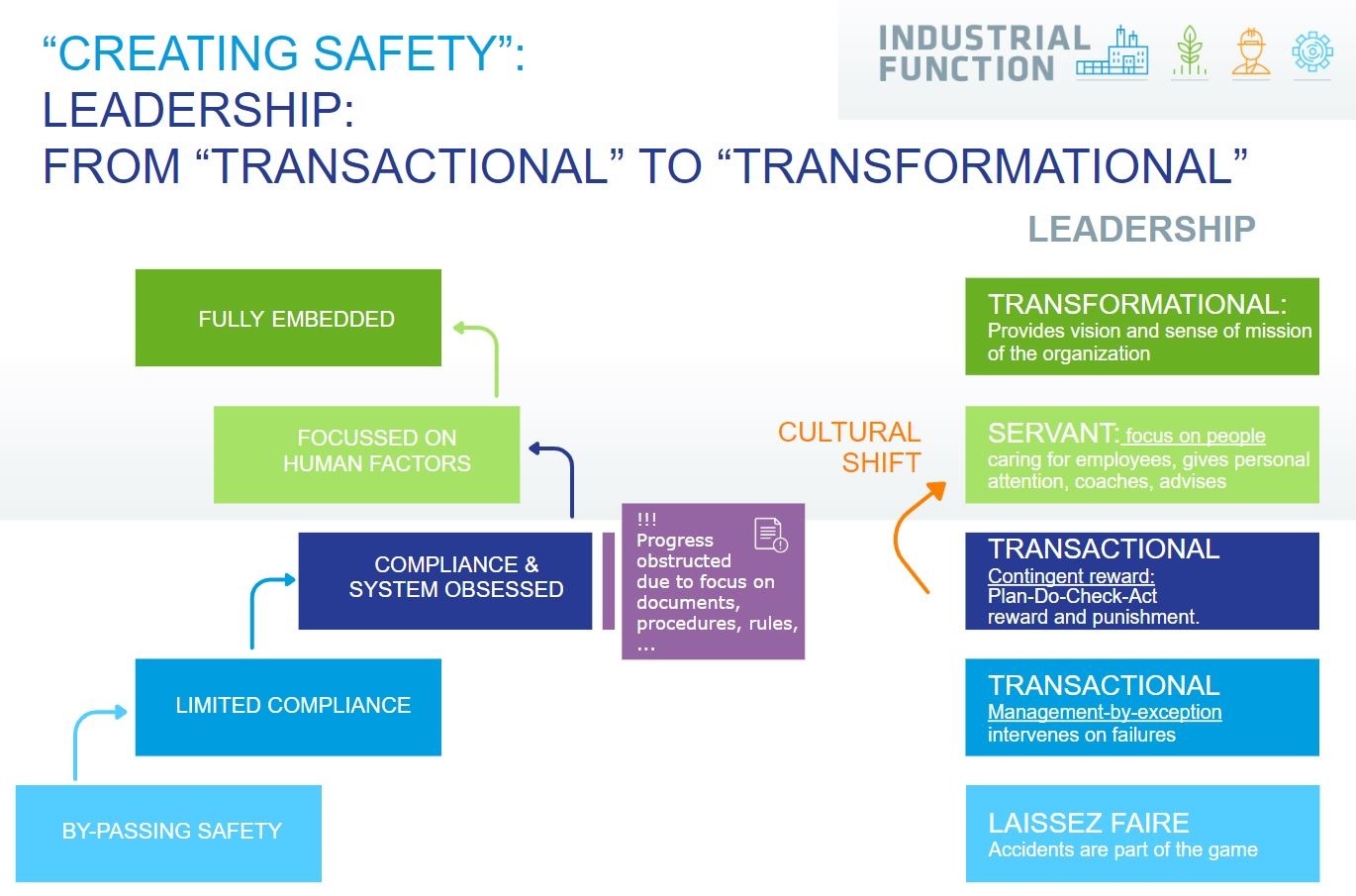 Safety Leadership is the ability of the Management to create a strong safety culture. This requires acts, visibility, safety dialogues, … and the promotion of positive attitudes and behavior in general and regarding HSE in particular. This leadership is necessary to move beyond a “have-to” safety culture: Reinforcing the safety culture relies on a safety leadership style where managers act as mentors and demonstrate genuine care for all.
