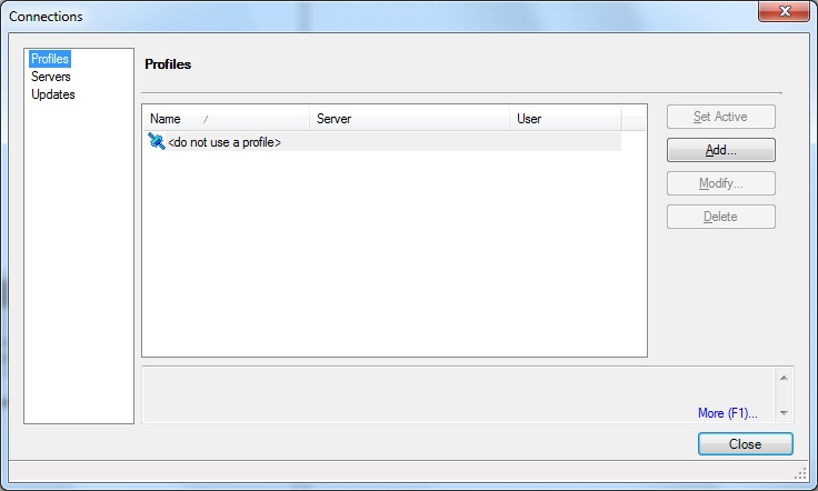 Complete access information's > Names : PROJECT_ENV_SERVER@LOGIN > Description : PROJECT_ENV_SERVER@LOGIN Server: > Remote Machine : > SERVER Use Integrated Windows Authentication Or Fill: > Save login in profile User : EUA/LOGIN Paswword : **** > Connect On Exit > SAVE
