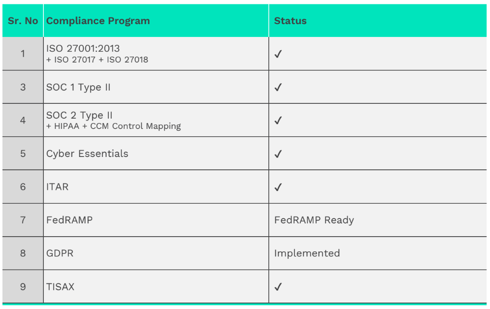 • Maintains ISO 27001, SOC 1/2, PCI DSS, HIPAA, and GDPR certifications through cloud provider (Azure) and internal policies.