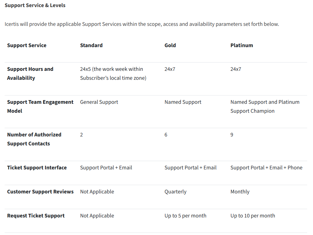 The support levels offered by ICertis are shown below. Syensqo has subscribed to the Standard support level.