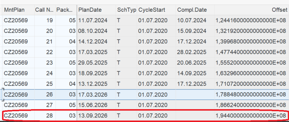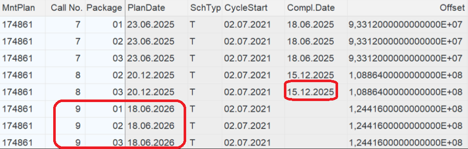 1. All relevant Maintenance Plans (MPLA-WARPL) in MHIS table, with the next planned call record after the call that has been completed