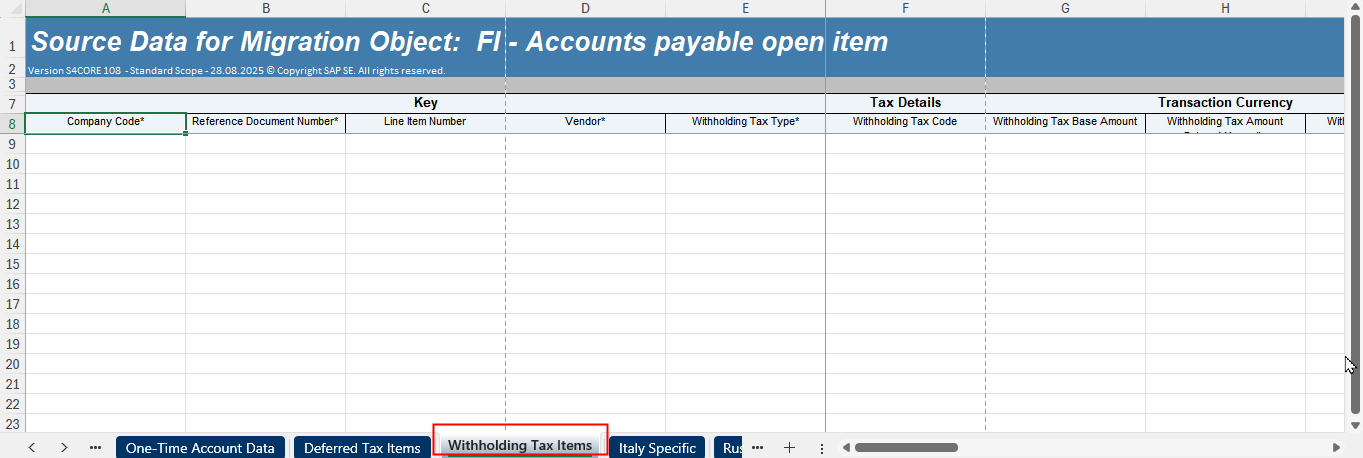 Scope of the migration is based on withholding tax linked to migrated AP OPEN ITEMS (9006), AP SPECIAL GL OPEN ITEMS (9007), AR OPEN ITEMS (9008) and AR SPECIAL GL OPEN ITEMS (9009), which have not been posted during legacy open item posting. The withholding tax codes will be mapped in a table (link). If such withholding tax codes are part of the AP/AR objects scope ie same document number/year/company code combination, the respective WITH_ITEM data will be extracted for migration together with each object. There will be no withholding tax posting /line item since it was not posted in legacy yet.