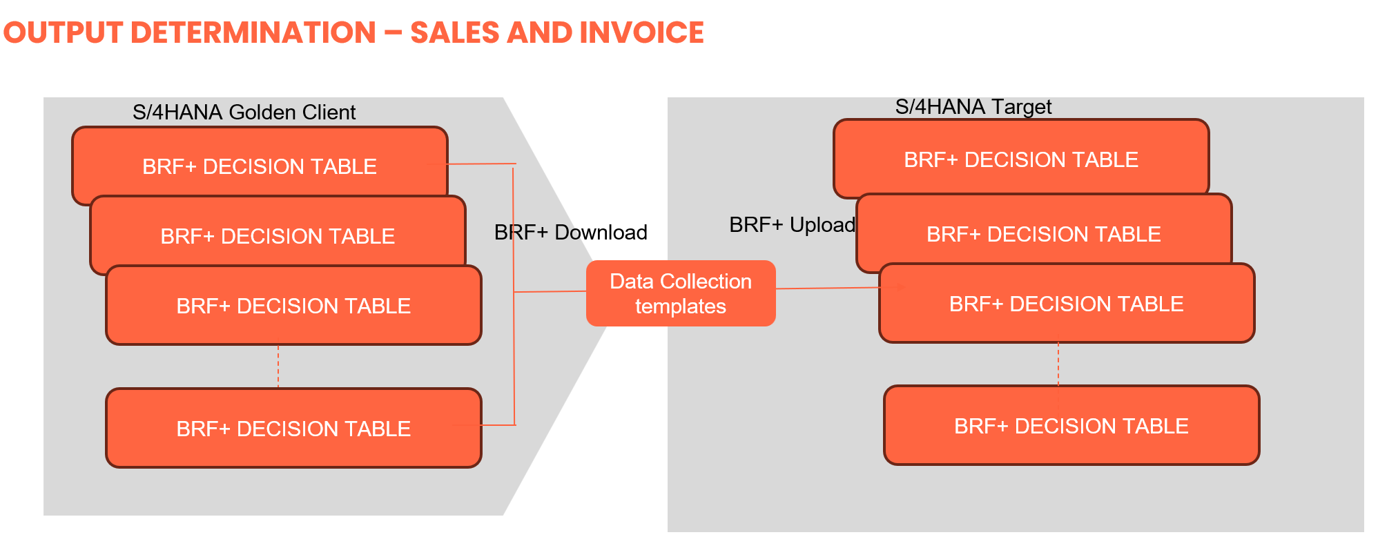 There will be no direct one-to-one mapping between ECC output condition records and BRF+ decision tables. Instead, this approach will use a rules-based model that covers the majority of business scenarios and reduces operational complexity.