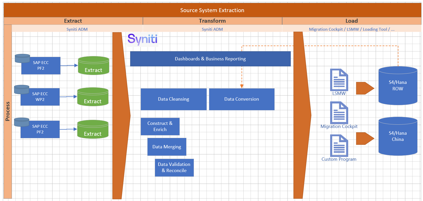 The extraction and transformation will be done by Syniti, while the loading will be executed by a Standard tool of SAP Migration Cockpit.